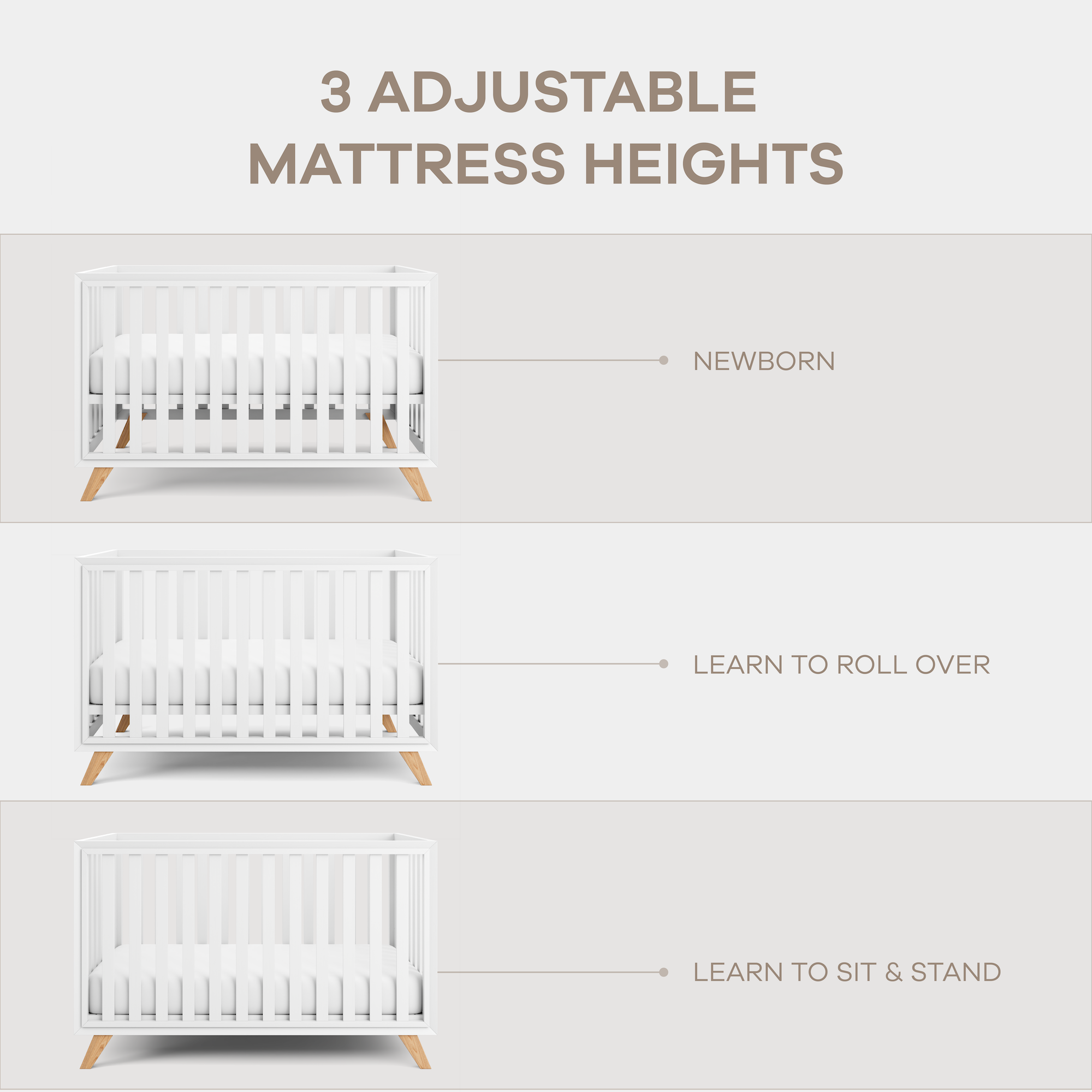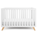 Multiple Baby Cribs Color Options: Choose from All White, Natural Wood, or stylish two-tone combinations like White Bars with Natural Wood Legs, designed to suit a variety of nursery sets and interior styles.