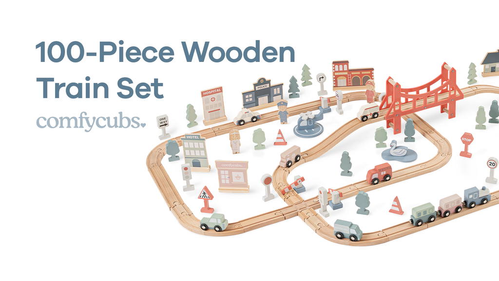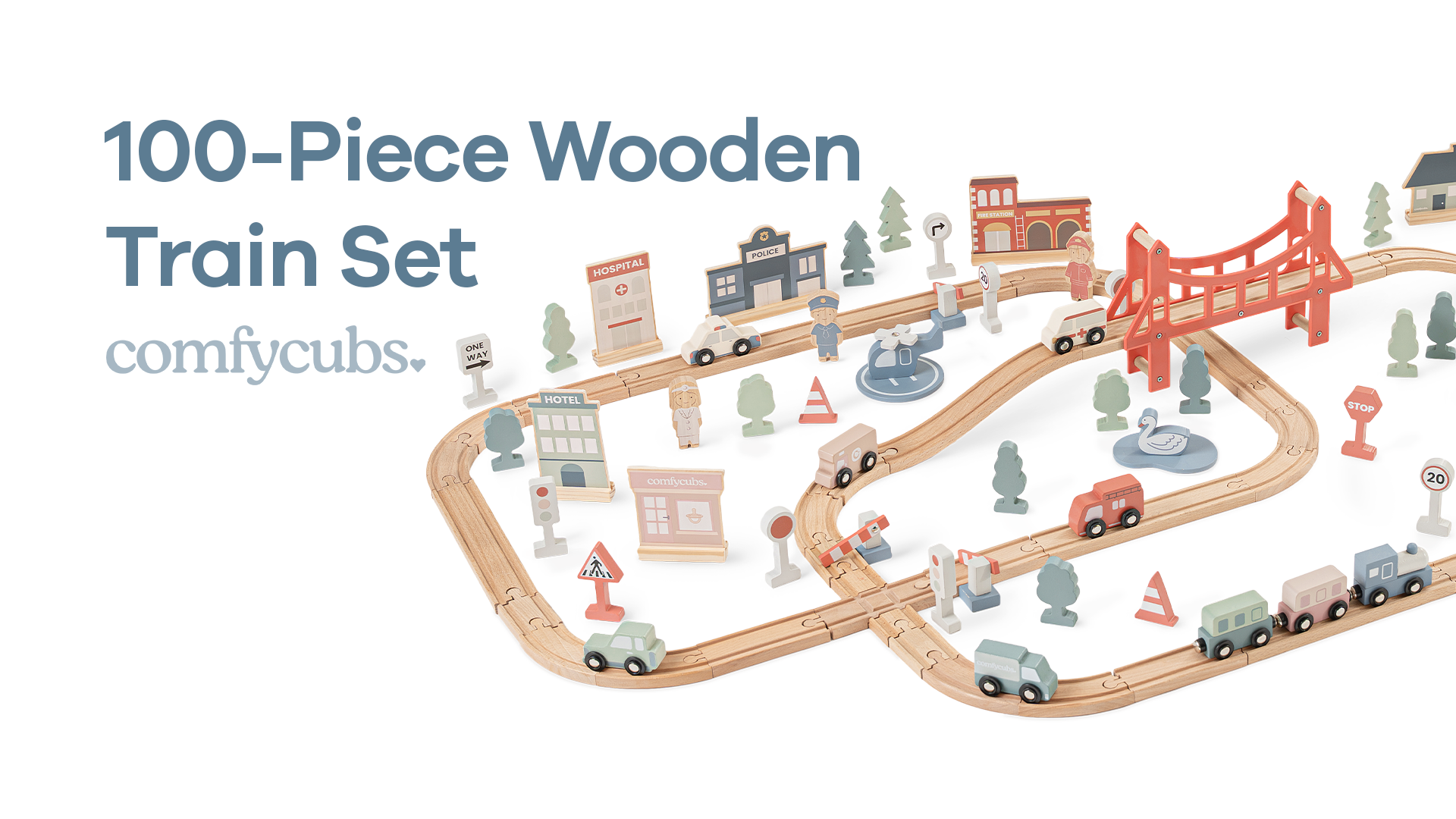 The Comfy Cubs 100-piece train toys set is a simple and engaging toy that provides toddlers a fun way to explore hands-on play. Designed for children aged one and up, this train set for toddlers features a mix of wooden tracks, trains, and town-themed accessories that can be arranged in many different ways. Our toy train sets are easy to set up, gentle to handle, and just the right size to introduce little ones to imaginative building.